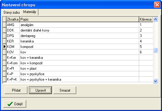 Nastavení umožňuje mazat a přidávat materiály nebo značky stavu chrupu. Dále je možné měnit klávesové zkratky a barvy, které jsou materiálům a stavům chrupu přiřazeny.