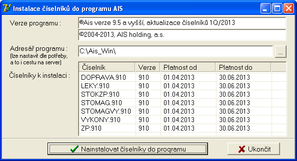 číselníků je uveden v položce "Číselníky k instalaci" :