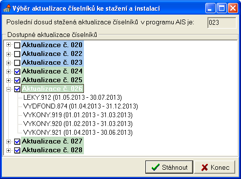 - V hlavním menu programu AIS zvolte "Soubor", "Aktualizace","Aktualizace číselníků".