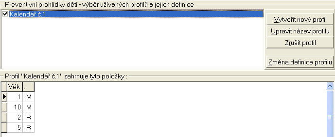 Umožňuje nadefinovat kalendáře prohlídek u dětí, z nichž každé může mít přiřazeno nanejvýš jeden. Přiřazení kalendáře konkrétnímu dítěti se provádí na kartě Prohlídky. Zatržený název určuje implicitní profil.