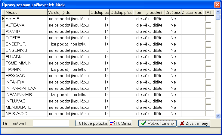Novou očkovací látku vložíte stiskem klávesy F5, klávesou šipka dolů na posledním řádku tabulky nebo tlačítkem ve spodní části otevřeného okna. Pokud chcete některou očkovací látku změnit, najeďte kurzorem myši a dvojitým kliknutím levého tlačítka vyvoláte okno se seznamem očkovacích látek. Mazat vybrané očkovaní můžete zmáčknutím kombinace kláves ctrl a delete, klávesou F8 nebo stiskem tlačítka ve spodní části okna.