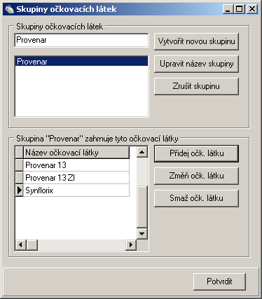 Vytvořené skupině můžete přiřadit očkovací látky, které lze mezi sebou zaměnit. Tlačítky napravo od seznamu můžete vkládat, měnit nebo mazat očkovací látky patřící do vybrané skupiny. Na obrázku můžete vidět příklad, kde jsou vybrány očkovací látky Provenar 13 (očk. látku hradí pacient), Provenar 13 ZI (pro pacienty s indikací, hradí clearingové centrum) a Synflorix (plně hrazený). Pokud si nastavíte podobně skupinu očkovacích látek a do očkovacího kalendáře si nastavíte libovolně jednu látku ze skupiny, při očkovaní pak budete schopni látky mezi sebou snadno zaměnit.