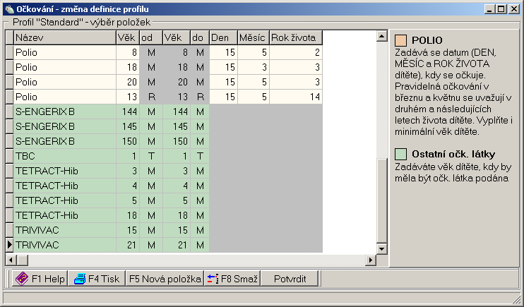 Poznámka: někdy je vhodné ponechat původní označení očkování POLIO (dle označení v DOS verzi). Ve výše uvedeném obrázku je to označení 6M a 8M v 2. kalendářním roce resp. 18M a 20M ve třetím roce života, samozřejmě s vlastností – dle kalendářního roku života.
