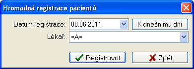 Někdy potřebujete zaregistrovat pacienty, kteří k vám sice chodí, ale nemáte (nebo si myslíte), že je nemáte zaregistrovány. V hlavním menu vyberte položku Přehledy pacientů - Pravidelně léčení a potvrďte nabídnuté volby. Klepnutím myší na tlačítko Hromadná registrace vyvoláte následující dialog, pomocí kterého dosud nezaregistrované pacienty zaregistrujete k datu, které si sami zvolíte.