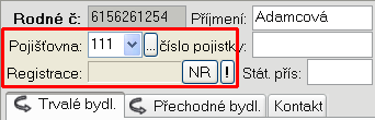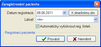 Dialog pro založení registrace vyvoláte kliknutím na tlačítko NR (nová registrace) vedle pole Registrace v Kartě pacienta. Pokud je pacient registrován, objeví se na tlačítku parafa příslušného lékaře.