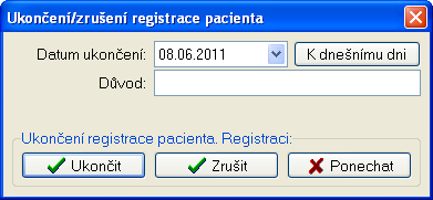Dialog pro ukončení registrace vyvoláte kliknutím na tlačítko ! (vykřičník) vedle pole Registrace v Kartě pacienta.